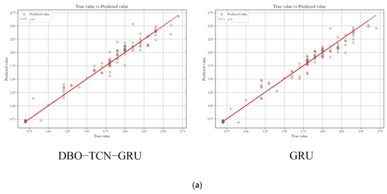 As shown in the scatter plot in Figure 8, the x-axis represents the true values and the y-axis represents the predicted values. From the scatter distribution in the graph, most of the points are located at or near the y = x line, which indicates that for most of the data points, the predicted values of these models are quite close to the true values. This trend indicates that the models are predicting with a high degree of accuracy. From the point comparison, it can be seen that the OTDBO−TCN−GRU model points are most concentrated on the y = x line, followed by the DBO−TCN−GRU model. In contrast, XGBoost and LSTM point locations are the most dispersed, i.e., the prediction results are poorer, and the model’s weak ability to cope with changes in the environment has limitations. More so, the OTDBO−TCN−GRU model has a strong coping ability for global prediction as well as environmental changes, and the prediction results are more accurate.