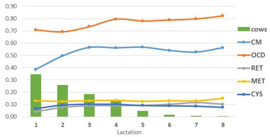 Incidence rates of udder, claw, and reproductive diseases and ratio of cows in lactations 1 to 8. CM—clinical mastitis, OCD—overall claw disease, RET—retained placenta, MET—metritis, CYS—cystic ovarian disease. Based on authors’ calculations from the database provided by the Holstein Cattle Breeders Association of the Czech Republic.