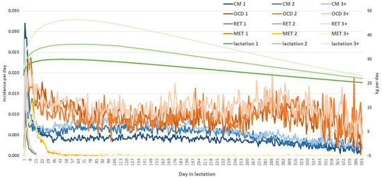 Daily milk yield (in kg) and daily incidence1 of udder, claw, and reproductive diseases treated with antibiotics in different lactations. 1 Number of cows having the disease treated with antibiotics; their milk had to be discarded on day i of lactation l divided by the number of cows in the herd on day i of lactation l. CM—clinical mastitis, OCD—overall claw disease, RET—retained placenta, and MET—metritis; 1—first, 2—second, and 3+—third and subsequent lactations. Based on authors’ calculations from the database provided by the Holstein Cattle Breeders Association of the Czech Republic.