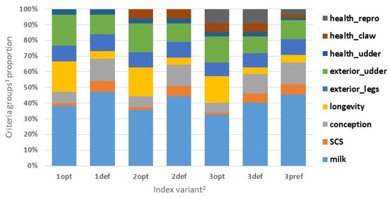Proportion of the selection criteria groups1 (%) in the index variant2. 1 Selection criteria groups: milk (%F, kgF, %P, kgP), SCS (somatic cell score), conception (CR), longevity (LONG), exterior_legs (RLRV, FA, LOC, LEGS), exterior_udder (FUA, FTP, TL, UD, RUH, CLI), health_udder (CM), health_claw (OCD, IDD, CHL), health_repro (RET, MET, CYS). For descriptions of the criteria abbreviations, see Table 2 and the Section 2. 2 Details of the investigated index variants are given in Table 5 and in the Section 2.