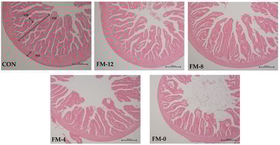 | Villus height | 1766.1 ± 139.5 a | 1759.8 ± 119.2 a | 1703.4 ± 250.1 a | 1477.7 ± 196.3 b | 1183.3 ± 138.8 c |