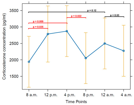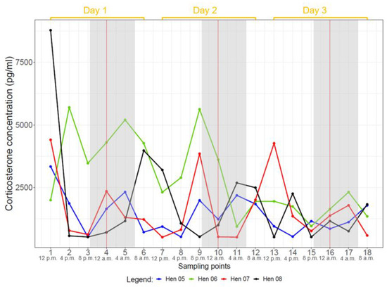 Hillebrecht, T.; Korbel, R.; Rinder, M.; Gahr, M. Circadian Corticosterone Profile in Laying Hens (Gallus gallus domesticus). Animals 2024, 14, 873. https://doi.org/10.3390/ani14060873