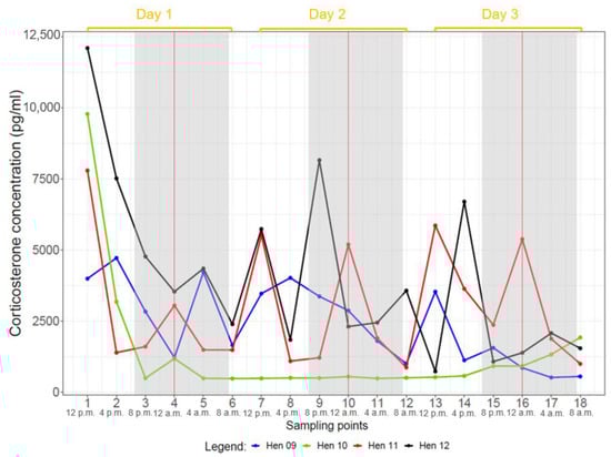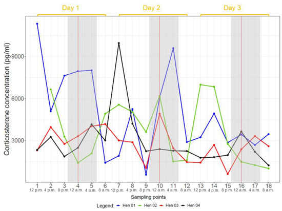 Hillebrecht T, Korbel R, Rinder M, Gahr M. Circadian Corticosterone Profile in Laying Hens (Gallus gallus domesticus). Animals. 2024; 14(6):873. https://doi.org/10.3390/ani14060873