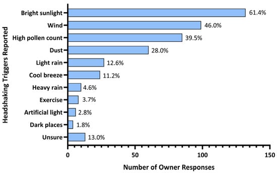 One respondent did not report any triggers and was not considered in the subsequent analyses. Bright sunlight was considered a headshaking trigger by 61.4% (n = 132) of respondents and 14.8% (n = 32) reported it as the only trigger for their horse. Additional triggers reported were wind (46.0%; n = 99), high pollen count (39.5%; n = 85), dust (28.0%; n = 60), light rain (12.6%; n = 27), presence of a cool breeze (11.2%; n = 24), heavy rain, (4.6%; n = 10), exercise (3.7%; n = 8), artificial light (2.8%; n = 6) and dark places (1.8%; n = 4). Triggers were not obvious, or difficulty identifying triggers was reported by 13.0% (n = 28) (Figure 1).