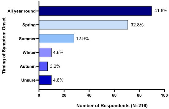 Seasonal onset of symptoms was reported by 53.7% (n = 116) of respondents, 41.6% (n = 90) reported that their horses exhibited HS symptoms all year round, while 4.6% (n = 10) reported that they were not sure if HS symptom onset was impacted by season. Spring onset was reported by 32.8% (n = 71) of respondents, summer onset by 12.9% (n = 28), winter onset by 4.6% (n = 10) and 3.2% (n = 7) reported autumn onset (Figure 2).