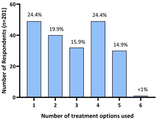 Of the 216 respondents, 15 (6.9%) reported not using any treatments. Further analysis was restricted to the remaining 201 respondents who reported treating their horse for HS. A quarter of respondents (24.4%; n = 49) reported the use of a single treatment. The remaining 75.6% reported using two or more treatments: 19.9% (n = 40) used two treatments, 15.9% (n = 32) used three treatments, 24.4% (n = 49) used four treatments, 14.9% (n = 30) used five treatments, and one (<1%) used six treatments (all treatment options provided in the survey; Figure 3).