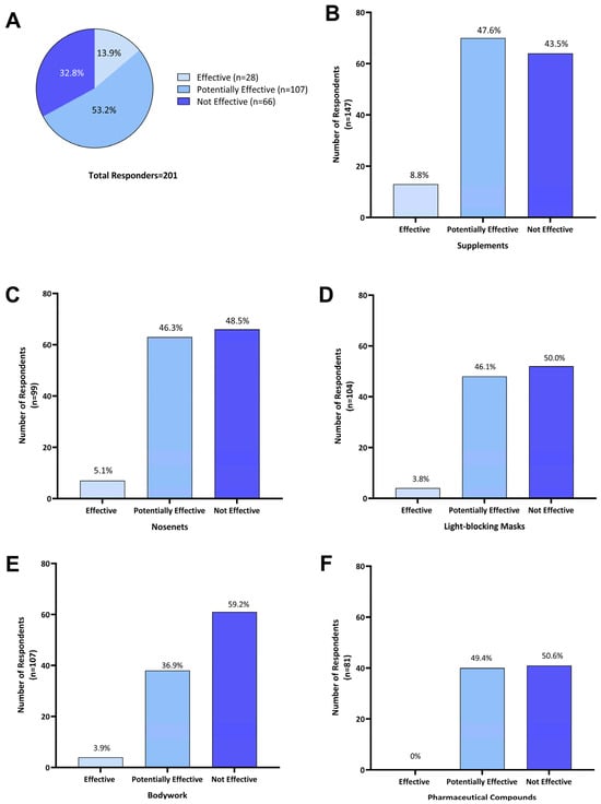 Light-blocking masks were used by 51.7% (n = 104) of respondents; 3.8% (n = 4) reported their use as ‘effective’ when used as a single treatment; for 46.1% (n = 48) they were ‘potentially effective’ when combined with other treatments; and 50.0% (n = 52) found them ‘not effective’ (Figure 5D).