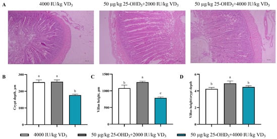 Effects of dietary supplementation of 25-OHD3 on intestinal morphology of laying hens. (A) The jejunum was stained with HE solution (300 microns, ×40). (B) Crypt depth. (C) Villus height. (D) Villi-length-to-crypt-depth ratio. The different superscript small letters were judged as a significant difference (p < 0.05).