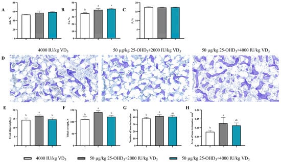 As shown in Figure 2, the Ca content in the 50 μg/kg 25-OHD3 + 2000 IU/kg VD3 group or 50 μg/kg 25-OHD3 + 4000 IU/kg VD3 groups were remarkably increased (p < 0.05) compared to the control group, but there were no significant variations for the content of ash and P (p > 0.05) in the tibia samples. Moreover, a histopathology evaluation of the tibia revealed the presence of a cortical bone structure and trabeculae in the tibia as closely arranged. The number and area of trabeculae in the 50 μg/kg 25-OHD3 + 2000 IU/kg VD3 group were significantly increased relative to the control group (p < 0.05). In addition, dietary 50 μg/kg 25-OHD3 and 2000 IU/kg VD3 supplementation increased the fresh tibia weight and strength (p < 0.05).