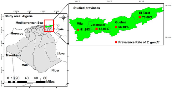 In different countries, breeding of goats is important for the economy, specifically for milk and meat production [19]. In Algeria, livestock husbandry, particularly small ruminant breeding, represents an important agricultural activity in the rural high plateaus and steppe areas. One of the most important areas for livestock production and agriculture is in northeastern Algeria, where goat farming is an additional economic activity that is primarily characterized by small, non-racial herds and tried-and-true specialties in an often semi-extensive system. The role of small ruminants, including goats, as a significant reservoir of zoonotic parasites such as T. gondii in rural areas of Algeria is poorly documented. Relatively limited epidemiological data are available in Algeria on toxoplasmosis in goats as well as in other animal species and humans [20,21]. The frequency of toxoplasmosis in goats in the northeastern region of Algeria has been reported in only one study so far [20]. To support current available data, the present study was conducted to provide the latest information on the seroprevalence of T. gondii infection in goats in northeastern Algeria and offer an up-to-date summary of potential associated risk factors using detailed statistical analysis.