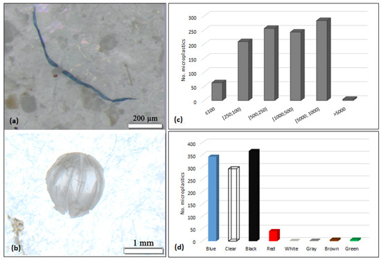 Regarding particle colour, a total of eight distinct colours were identified in the samples (Figure 2d). The predominant colours were black (34%; n = 366), blue (32%; n = 343), and clear (28%; n = 294). The other encountered colours (i.e., red, white, grey, brown, green) comprised a cumulative proportion of 6% (n = 56).