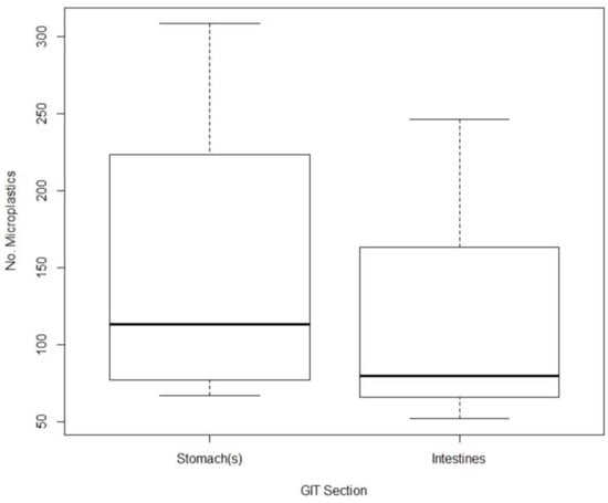 Boxplot showing the median number of microplastics in the intestine and stomach.