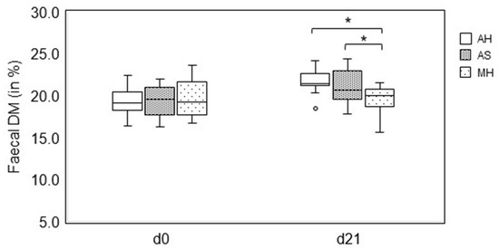 Comparison of the faecal dry matter (DM) among feeding alfalfa hay (AH), alfalfa haylage (AS) and meadow hay (MH) on day 0 (d0) and day 21 (d21). The box represents the first and third quartiles, the horizontal line represents the median; the upper and lower whiskers are a maximum of 1.5 times the interquartile range. Points (°) represent outliers. The symbols (*) above the brackets indicate significant differences (p < 0.05). Data were analysed by ANOVA with covariance and a post hoc test (Fisher’s LSD).