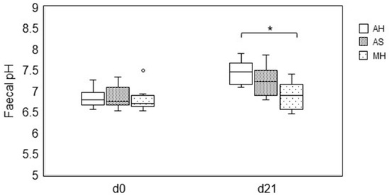On d0, no difference was found in the faecal pH among the diets. Horses fed AH had a significantly higher median faecal pH on d21 (7.47 (7.17/7.67) than horses fed MH (6.90 (6.57/7.17)) (p = 0.004). Horses fed AS (7.23 (6.90/7.50)) showed no significant difference in their median faecal pH compared with those fed MH on day 21, but a tendency (p = 0.151) was observed. No significant difference was found in faecal pH between horses fed AH and AS on d21 (Figure 2).