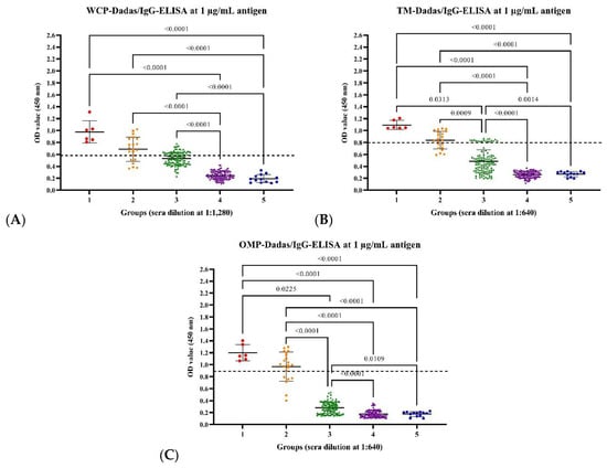 The levels of IgG antibody detected in modified ELISAs against whole-cell protein (WCP), total membrane protein (TMP), and outer membrane protein (OMP) from the local Thai isolate of Leptospira serovar, including serovar Dadas, at 1:1280 (A), 1:640 (B), and 1:640 (C) sera dilutions. Comparisons among 260 sera from five groups consisting of dogs from Nan Province confirmed as infected via PCR and isolation (Group 1), unvaccinated dogs from Nan Province (Group 2), vaccinated dogs from Bangkok (Group 3), unvaccinated dogs from non-endemic areas (Group 4), and unvaccinated puppies from non-endemic areas (Group 5). The significant differences of the IgG antibody levels between dog sera group were analyzed using Kruskal–Wallis test and Dunn’s post hoc test (p-value < 0.05). (A–C) demonstrated the modified ELISAs against WCP, TMP and OMP from serovar Dadas identified that dogs from endemic area (groups 1 and 2) have the higher level of IgG antibody than dogs in non-endemic areas (groups 3, 4, and 5), with a highly significant difference.