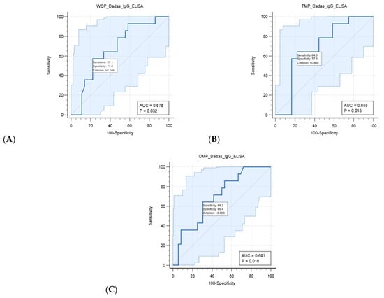 Receiver–operator curve (ROC) and area under the curve of ROC (AUC) of modified ELISAs against whole-cell protein (WCP), total membrane protein (TMP), and outer membrane protein (OMP) from the local Thai isolates of Leptospira serovars, including serovar Dadas, at 1:1280 (A), 1:640 (B), and 1:640 (C) sera dilutions, with 50 sera from three groups consisting of dogs from Nan Province confirmed as infected via PCR and isolation (Group 1), unvaccinated dogs from Nan Province (Group 2), and vaccinated dogs from Bangkok (Group 3). All the ROC curve and AUC of the ROC of modified ELISAs were analyzed by MedCalc software. (A–C) displayed the sensitivity and specificity of the modified ELISAs against WCP, TMP and OMP from serovar Dadas using the cut-off OD values that were set by ROC analysis showed the moderate sensitivity, specificity and AUC, with p-value < 0.05.