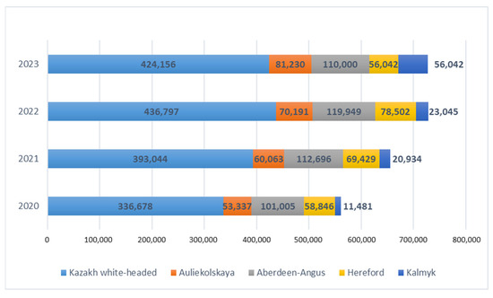 The number of breeding cattle of the studied breeds in the Republic of Kazakhstan for 2020–2023, heads.