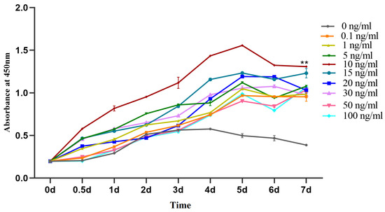 In the culture of sheep with follicular GCs, different concentrations of FSH were added and cultured at different times. CCK-8 reagent was used to determine the cell proliferation rates at ten FSH concentrations (0 ng/mL, 0.1 ng/mL, 1, 5 ng/mL, 10 ng/mL, 15 ng/mL, 20 ng/mL, 30 ng/mL, 50 ng/mL, 100 ng/mL) and eight-time points (0 d, 0.5 d, 1 d, 2 d, 3 d, 4 d, 5 d, 6 d, and 7 d) (Figure 1). The results showed that with the increase in FSH treatment time, the growth density of GCs gradually increased, and the proliferation rate reached the highest point on the fourth and fifth days of culture. From the fifth day to the seventh day, due to the excessive cell convergence rate, partial death occurred, and the cell proliferation rate tended to decrease. By comparing the cell proliferation rate of 10 ng/mL, FSH was significantly higher than other concentrations (p-value < 0.05), indicating that an optimal dose of FSH could significantly improve the proliferation ability of GCs. Therefore, we selected 10 ng/mL FSH as the optimal dose of FSH hormone to be added to cultured granulosa cells.