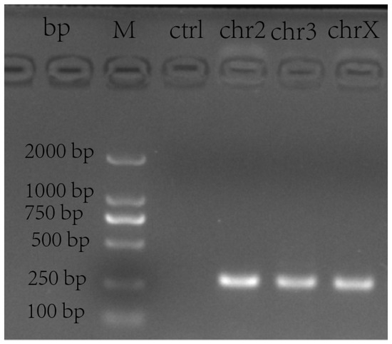 PCR amplification band position and specificity detection. The PCR amplification shows the length of bands in three chromosomes’ (chr2, chr3, chrX) knockout cell libraries and blank granulosa cells (ctrl).
