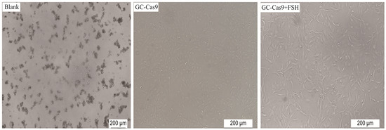 Chromosome 2, chromosome 3, and chromosome X, which have relatively high gene density and are enriched in genes related to development, reproduction, and immune processes, were selected for GC knockout. After each library virus infected the GC cells, the knockout cell library GC-Cas9 was obtained after 1 μg/mL puromycin screening. When 10 ng/mL FSH was added to GC-Cas9 (GC-Cas9 + FSH), it was found that the cells in the FSH-added group grew faster than those in the non-added group, while all normal GCs in the blank control died (Figure 3).