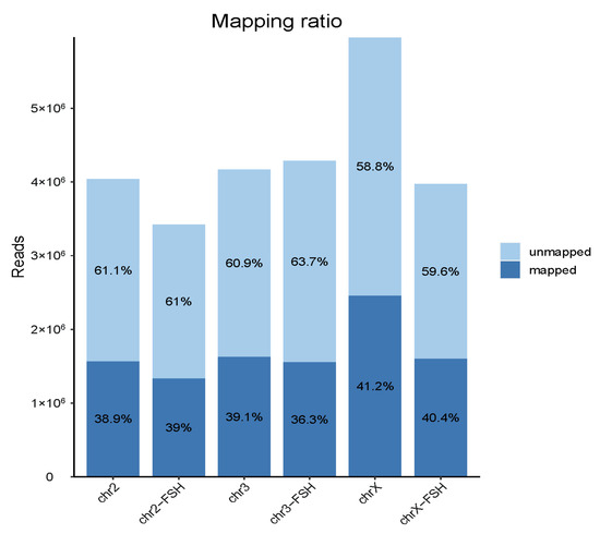 Read counts and mapping percentages of sgRNA sequencing in different treatment groups of GC genome knockout cells. chr2 was used as the initial cell library before screening the chromosome 2 virus library; chr2-FSH was used as the treatment group with 10 ng/mL FSH; chr3 was used as the initial cell library before screening the chromosome 3 virus library; chr3-FSH was used as the treatment group with 10 ng/mL FSH; chrX was used as the initial cell library before screening the chromosome X virus library; and chrX-FSH was used as the treatment group with 10 ng/mL FSH.