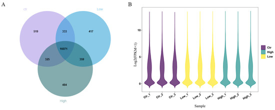 In all samples, a total of 18,508 genes were expressed (FPKM > 0.1), of which 17,248, 17,180, and 17,239 genes were expressed in the control group, low-dose group, and high-dose group, respectively (FPKM > 0.1). In addition, 16,071 genes were expressed in all samples and were considered to be widely expressed genes (Figure 7).