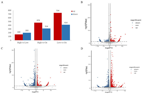 Changes in the expression profile of genes in GCs. (A), Number of different genes in each group of GCs; (B–D), volcano plot indicating up- and down-regulated genes of GCs in different FSH treatment groups (high versus low, high versus control, and low versus control), respectively.