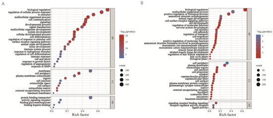 Gene ontology (GO) analysis of differentially expressed genes in different FSH treatment groups: (A) up-regulated genes; (B) down-regulated genes.