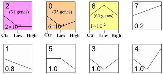 Eight profiles of positive–negative target genes with unique expression alterations over control (control group, 0 ng/mL FSH), low (low-dose group, 10 ng/mL FSH) and high (high-dose group, 100 ng/mL). The profile number is shown at the top left corner of each square. The p-value in each profile is shown at the bottom left corner of each square. Colored profiles have a statistically significant number of genes assigned, meanwhile the colors are randomly assigned.