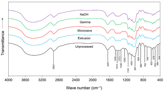 FTIR spectra of unprocessed, extruded, microwave-irradiated, gamma-irradiated, and NaOH-treated cassava chips.