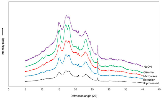 Diffraction patterns of unprocessed, extruded, microwave-irradiated, gamma-irradiated, and NaOH-treated cassava chips.