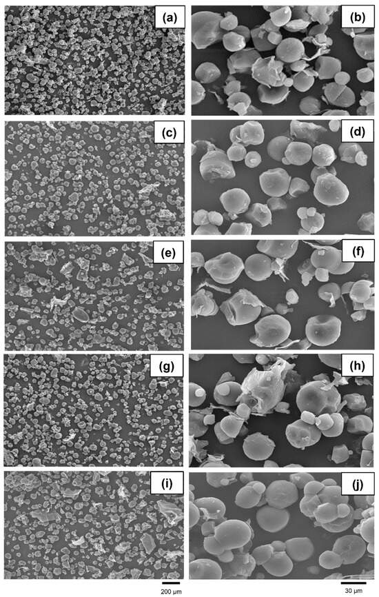 Microstructures of unprocessed (a,b), extruded (c,d), microwave-irradiated (e,f), gamma-irradiated (g,h), and NaOH-treated (i,j) cassava chips. Magnifications of photographs were recorded at 250× (left) and 1500× (right).