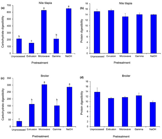 In vitro digestibility of carbohydrate (µmol maltose g sample−1, left) and protein (mmol DL-alanine equivalent g sample−1, right) of unprocessed and pretreated cassava chips. The sources of enzymes for in vitro testing were Nile tilapia (a,b) and broiler (c,d). Data are expressed as means ± SEM (n = 3). Significant differences between treatments are indicated by different superscripts (p < 0.05).