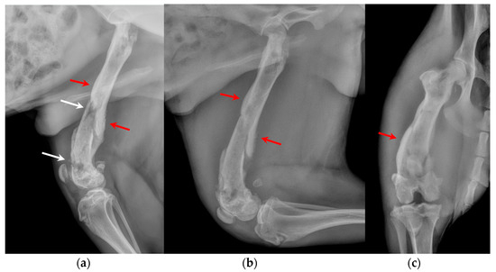 An 8-month-old American Staffordshire terrier weighing 25 kg was referred to the Orthopedic Veterinary Trauma Center (Arenzano, Italy) for no-weightbearing lameness of the right hind limb. The lameness had suddenly arisen two weeks earlier without any traumatic episode, and it showed a progressive worsening. During this time, the owner reported that the dog experienced recurrent episodes of intermittent hyperthermia. Two months before, endocarditis was diagnosed in the patient and treated with antibiotic therapy in another veterinary hospital.