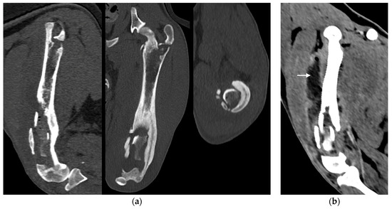 Figure 10). To improve the postoperative assessment, CT scans of the right stifle joint were obtained. A modified Robert Jones splint was applied for 24 h postoperatively. Meloxicam (0.1 mg/kg) once a day and amoxicillin and clavulanic acid (20 mg/kg) twice a day were prescribed for 10 days, pending the results of a bacteriological examination, and only short walks on the leash to be gradually increased during the two months of postoperative rehabilitation were recommended. After 5 days, the bacteriological exam results were negative, and the antibiotic therapy was continued as indicated previously.