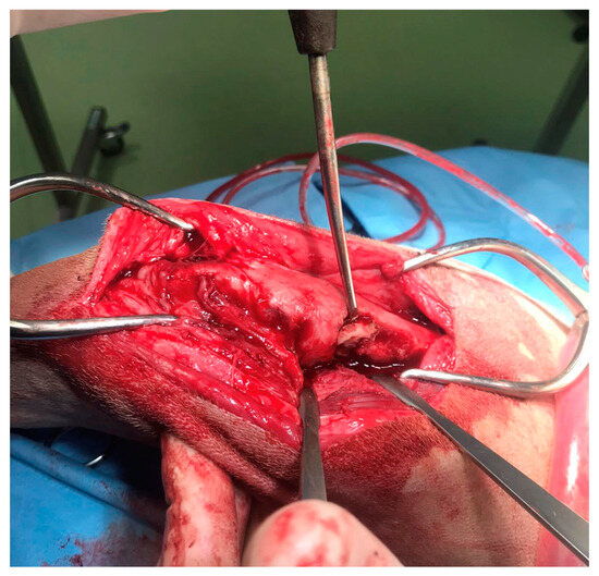 In agreement with the owner, a surgical procedure was performed in order to remove the bone sequestrum, debride necrotic tissues and perform a copious lavage of the affected region (