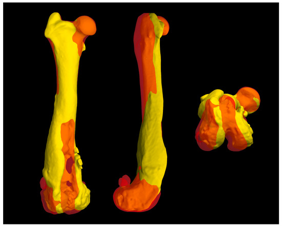 The 3D models of normal and pathological femurs were made using the same software and their superimposition allowed us to observe the presence of a slight distal femur varus of the right hindlimb, so slight as to not require surgical correction. No other differences were detected in the frontal, sagittal and axial planes (