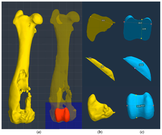 A 3D reconstruction of the hind limbs was performed in order to evaluate their alignment and to design a custom-made PGR: a custom-made implant that fills the bone gap and allows the restoration of the articular surface of the missing femoral trochlea. BonaPlanner computer-aided design CAD software (Bonabyte LLC, Moscow) was used to perform the 3D reconstruction of the hind limbs and the design and manufacture of the cutting guide and custom-made PGR. After uploading the DICOM files of the CT images onto BonaPlanner software, the DICOM files was segmented to STL files to obtain 3D models and allow the imaging processing.