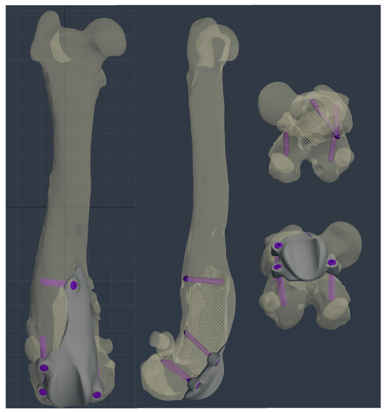 16]. The portion of the prosthesis designed to fill the bone defect had a porous structure with a cell size of 0.7–1 mm to promote the bone growth and osseointegration. The custom-made PGR prosthesis was secured to the bone with four locking screws (2.7 mm, Ti-6Al-4V ELI). The four holes for screws were designed one lateral and one medial to the distal margin of the lateral and medial trochlear ridges, respectively; one lateral to the proximal end of the lateral trochlear ridge and one in the center of the femoral diaphysis, in the most proximal end of the bone defect (