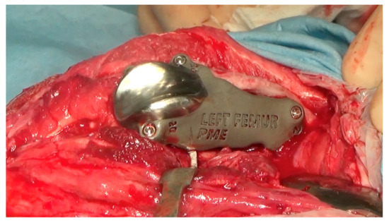 After reflection of the patella and the exposure of the cranial surface of the distal femur, the debridement of the fibrous tissues from the cranial surface of the distal femoral metaphysis was performed using a pneumatic drill with diamond burs (Surgairtome two, Hall), in order to allow the placement of the osteotomy guide. Once the guide was properly positioned, the guide was fixed with four 2.0 mm Steinmann pins into the four designed holes. The osteotomy was performed with a motorized oscillating saw inserting the saw blade of 1 mm into the lateral slot in order to perform a lateral–medial osteotomy: the plan of osteotomy extended from the level of the origin of the tendon of the EDPL to the proximal end of the partially intact lateral trochlear ridge. The osteotomy guide was removed and the custom-made PGR prosthesis was applied. Once it was verified that the holes made for the application of the pins fit perfectly with the holes of the implant for the insertion of the screws, the custom-made PGR was stabilized to the bone with the four 2.7 mm titanium locking screws described previously (