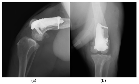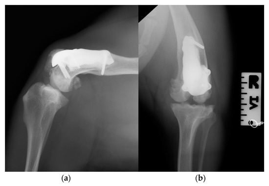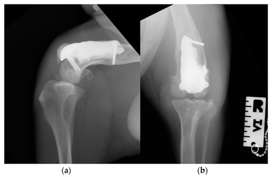Postoperative medio-lateral and caudo-cranial radiographs of the stifle joint were performed to evaluate the proper prosthesis position and the length of the screws and to confirm the patellar reduction (