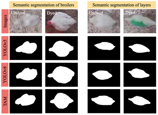 In our rigorous comparative analysis of segmentation methodologies for chicken tracking analysis, we evaluated YOLOv5, YOLOv8, and TAM. The chicken dataset, encompassing 1000 images, served as the foundation for this analysis. For the models necessitating training phases, specifically YOLOv5 and YOLOv8, a distribution of 600 images was allocated for training, 200 for validation, and the residual 200 for testing. The training regimen was orchestrated within a Python 3.7 environment, harnessing the capabilities of the PyTorch deep learning library, facilitated by an NVIDIA-SMI graphics card with a 16 GB capacity. Our segmentation efficacy evaluation spanned four distinct chicken categories: undyed broilers, undyed layers, dyed broilers, and dyed layers. A recurrent theme was the enhanced segmentation precision observed in dyed chickens, attributed to the pronounced color contrast introduced by dyeing, which counteracted the challenges posed by the chromatic resemblance between the chickens’ white plumage and the light brown litter. Despite the distinction between broilers and layers, no significant segmentation performance variance was observed, suggesting challenges predominantly driven by color rather than morphology. Among the methodologies, TAM, leveraging its pre-trained model, consistently outperformed both YOLOv5 and YOLOv8. This superiority can be attributed to TAM’s architectural robustness, its adeptness at high-dimensional feature extraction, and the efficacy of its pre-trained model [17], which potentially aligns better with the challenges presented by the chicken dataset. The forthcoming mIoU values in Table 1 will further detail TAM’s segmentation prowess, and a visual representation in Figure 4 underscores its potential as a leading choice for future chicken segmentation research.