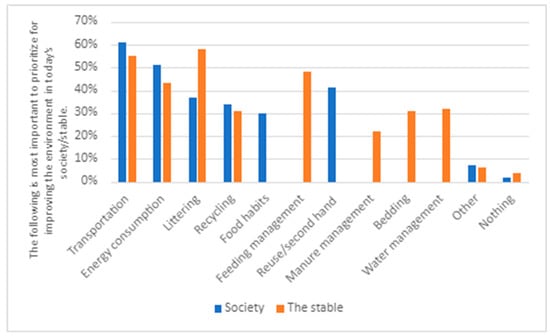 The second theme draws from responses in the survey and interviews related to what the respondents to the survey and interviewees identified as the most important to prioritize to improve the environment in society and what are the biggest environmental challenges in the stable (see Figure 1 and Figure 2). This allowed us to see if respondents’ and interviewees’ environmental engagement in society, in general, is reflected in their environmental engagement related to the stable.
