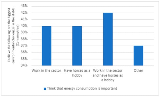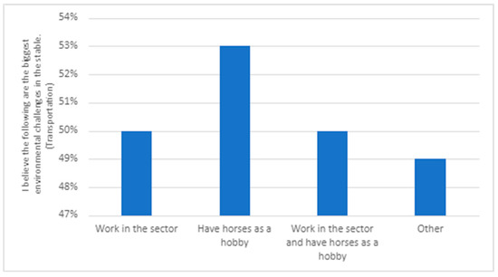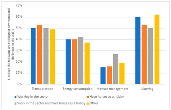 The responses were similar irrespective of the respondents’ role in the equine sector (Figure 2). Respondents to the survey believed that littering is the most significant environmental problem. There are, however, some differences. With regard to transportation, those with horses as a hobby consider this as more of a significant environmental issue than those working in the sector. The opposite applies for energy consumption and manure management; regarding these issues, those working in the sector see them as more important than the hobby riders.