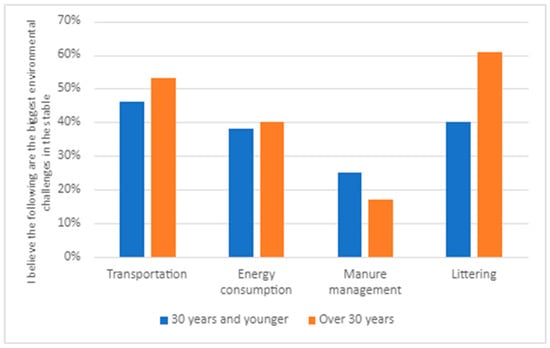 Responses to the question ‘I believe the following are the biggest environmental challenges in the stable’ divided into 30 or younger and those older than 30 years (All respondents N = 530; 30 years or younger N = 204; older than 30 years N = 326).
