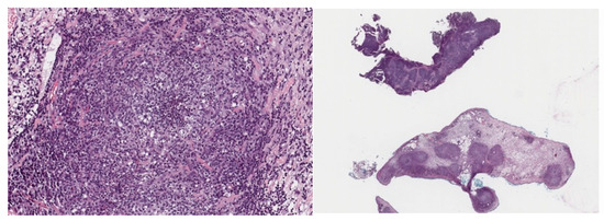 Histopathology images of two samples obtained from the mesenteric lymph nodes biopsied.