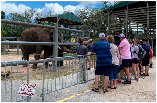 As zoos strive to provide excellent welfare for their individual residents while addressing the concerns of their visitors, it is essential to delve beyond the caregivers’ and elephants’ experiences of their interactions and consider how patrons perceive those interactions. Visitor satisfaction is paramount for zoos, as it directly impacts their economic viability, which then affects zoos’ capacity to fund conservation efforts, provide stimulating environments for their resident animals, and employ skilled staff, among other community contributions [2]. Furthermore, this research explores both consumer satisfaction (visitors’ likes/dislikes) with an organizational product (e.g., tours that require a separate purchase from front-gate admission) and animal satisfaction (expressed through visitors’ perceptions of elephants’ emotions and welfare states that are then viewed through the lens of an established welfare assessment tool). These components draw together data at the crux of Zoo Tampa’s and the Association of Zoos and Aquariums’ (AZA’s) missions, both of which reference animal care and visitor engagement [5,6].