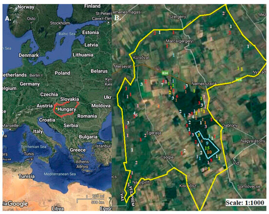 (A) Location of Hungary in Central Europe. The yellow dot marks the location of the hunting area. (B) The 11,893-hectare hunting area with the marking of the wild boar garden, which is 248 hectares. On the map, the numbers represent the number of wild boars shot at the marked location; yellow for 2015, brown for 2016, blue for 2017, green for 2018, orange for 2019, purple for 2020, and white for 2021, with red numbers indicating the drop locations of individuals shot in 2022 and pink for 2023. (Source: maps.google.com, accessed on 14 February 2024).
