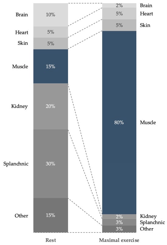 During warm-up, physiological changes are initiated such as the distribution of cardiac output (blood flow) to skeletal muscles and other organs as illustrated in rest (left) and maximal exercise (right). Note the largely increased cardiac output toward skeletal muscles (dark blue). Adapted from [21] with permission from John Wiley & Sons, Inc.