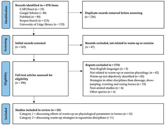 The traditional method was conducted using a general search function with the keywords in Google Scholar and the University of Liège library website. Publication titles were scanned for relevance to warm-up in horses or ponies, and a list of relevant articles was created in a Microsoft Excel file. The search engine method was conducted using the same keywords as the traditional method to search for all studies in three different databases (CAB Direct, PubMed, and Scopus). The advanced search was used in these databases, where the above keywords were used within “article title, abstract, and keywords” only. The titles of articles were also exported into the Microsoft Excel file. Then, the titles from both search methods were combined to create a new dataset, and duplicates were removed. The hyperlinks to the accessed websites are shown in Appendix A.